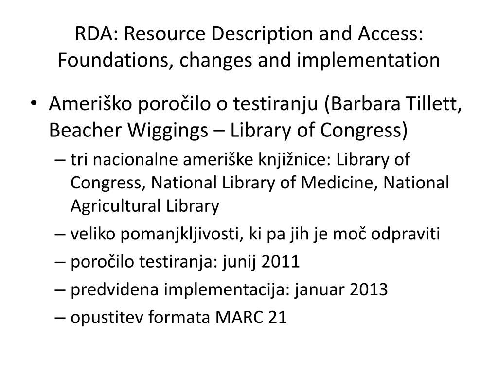 RDA: ResourceDescriptionand Access: Foundations, changesandimplementation • Ameriško poročilo o testiranju (Barbara Tillett, BeacherWiggings – LibraryofCongress) • tri nacionalne ameriške knjižnice: LibraryofCongress, NationalLibraryof Medicine, NationalAgriculturalLibrary • veliko pomanjkljivosti, ki pa jih je moč odpraviti • poročilo testiranja: junij 2011 • predvidena implementacija: januar 2013 • opustitev formata MARC 21