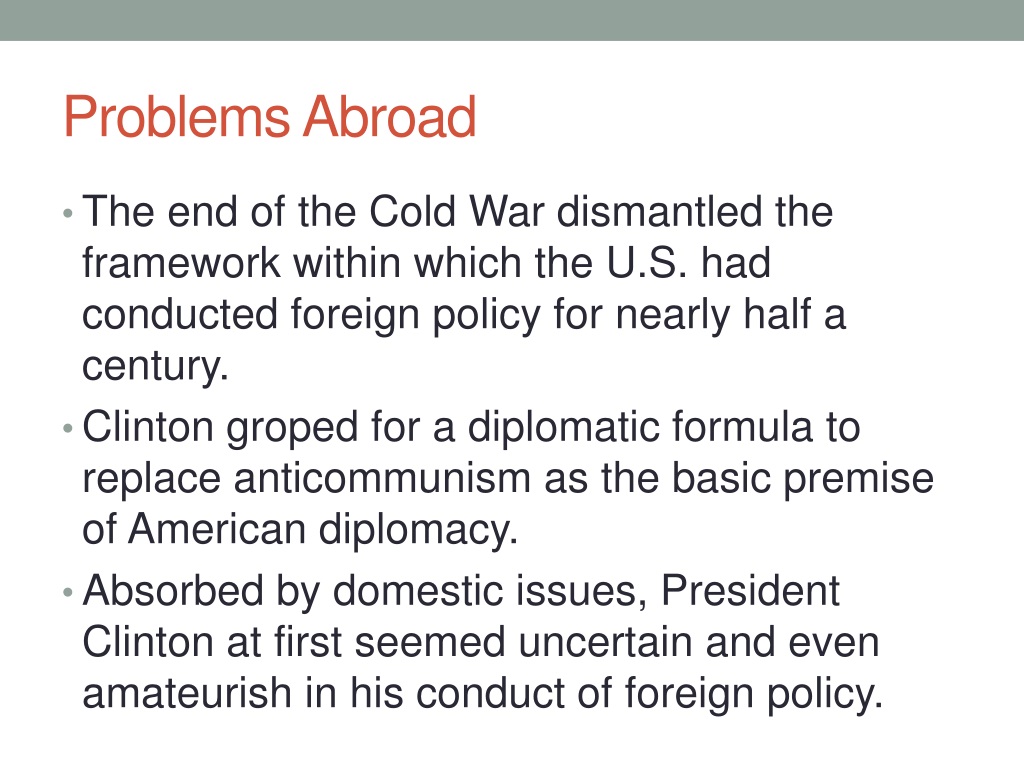 Problems Abroad • The end of the Cold War dismantled the framework within which the U.S. had conducted foreign policy for nearly half a century. • Clinton groped for a diplomatic formula to replace anticommunism as the basic premise of American diplomacy. • Absorbed by domestic issues, President Clinton at first seemed uncertain and even amateurish in his conduct of foreign policy.