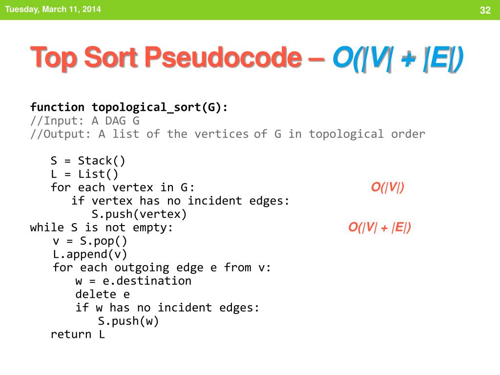 function topological_sort(G): //Input: A DAG G //Output: A list of the verticesof G in topological order S = Stack() L = List() for each vertex in G : O(|V|) if vertex has no incident edges: S.push(vertex) while S is not empty: O(|V| + |E|) v = S.pop() L.append(v) for each outgoing edge e from v: w = e.destination delete e if w has no incident edges: S.push(w) return L Top Sort Pseudocode – O(|V| + |E|)