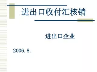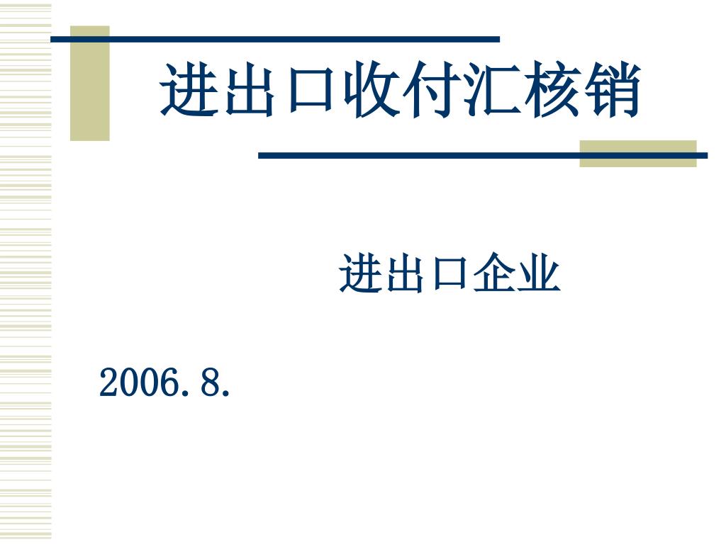 进出口收付汇核销. 进出口企业 2006.8. . 一、现行外汇管理基本框架. 经常项目完全可兑换 经常项目概念 : 一 国在一定时期经常发生的对外经济交易活动 。 资本项目部分可兑换 资本项目概念 : 国与国之间发生的资本流出与流入 . 主要有 外债、直接投资、证券投资。. 二、经常项目概念. 货 物: 进出口货物. 服 务: 运输、旅游、通讯、保险、计算机和信息服务等 13 个项目. 经常项目. 收 益: 职工报酬和投资收益. 经常转移: 侨汇、无偿捐赠和赔偿等. 条例. 基金. 三、经常项目外汇管理原则.