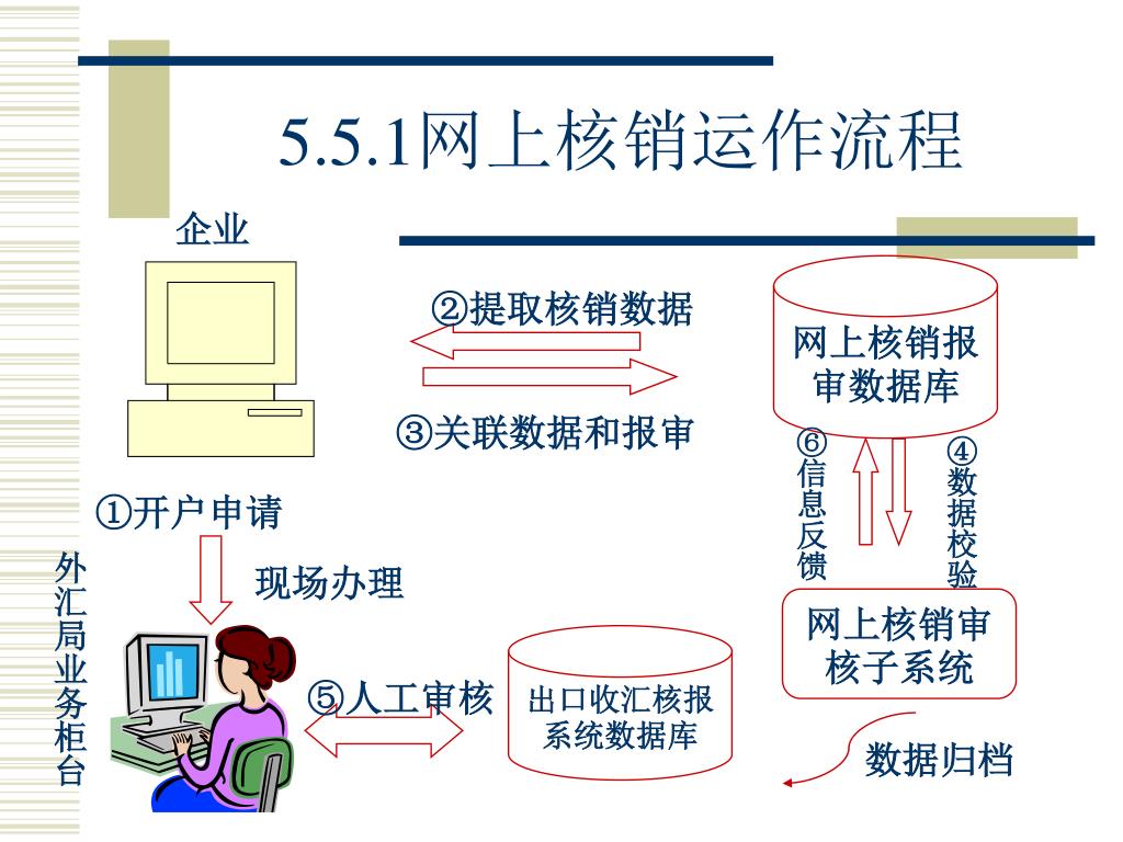 5.5.1网上核销运作流程 企业 网上核销报审数据库 ②提取核销数据 ③关联数据和报审 ⑥信息反馈 ④数据校验 ①开户申请 外汇局业务柜台 现场办理 网上核销审核子系统 出口收汇核报系统数据库 ⑤人工审核 数据归档