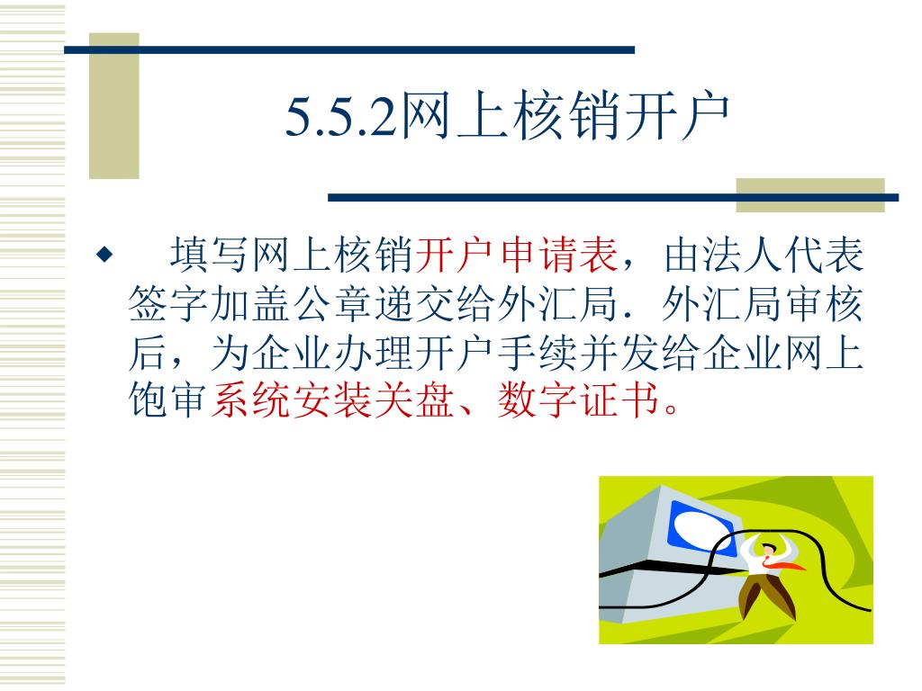 5.5.2网上核销开户 • 填写网上核销开户申请表,由法人代表签字加盖公章递交给外汇局.外汇局审核后,为企业办理开户手续并发给企业网上饱审系统安装关盘、数字证书。