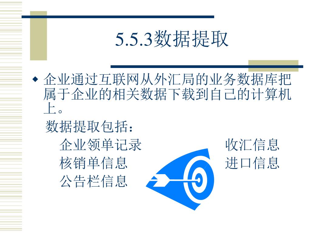 5.5.3数据提取 • 企业通过互联网从外汇局的业务数据库把属于企业的相关数据下载到自己的计算机上。 数据提取包括: 企业领单记录 收汇信息 核销单信息 进口信息 公告栏信息