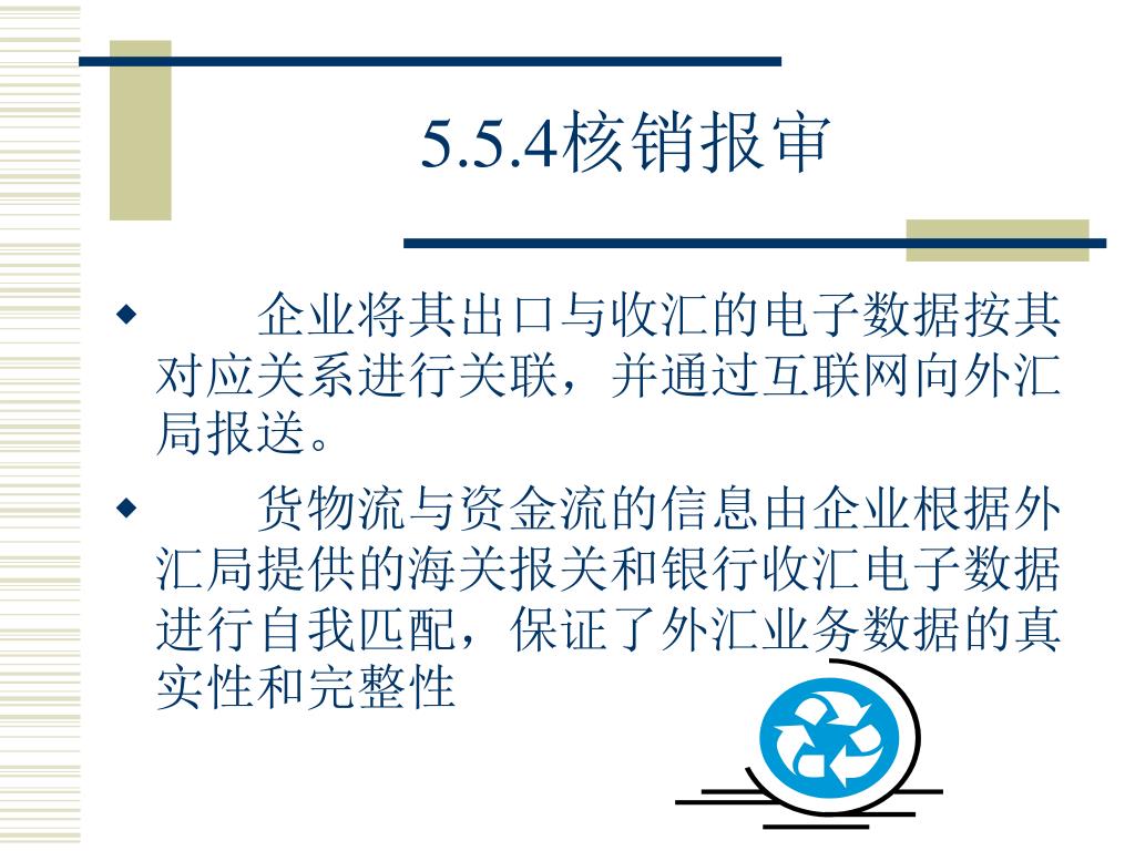 5.5.4核销报审 • 企业将其出口与收汇的电子数据按其对应关系进行关联,并通过互联网向外汇局报送。 • 货物流与资金流的信息由企业根据外汇局提供的海关报关和银行收汇电子数据进行自我匹配,保证了外汇业务数据的真实性和完整性