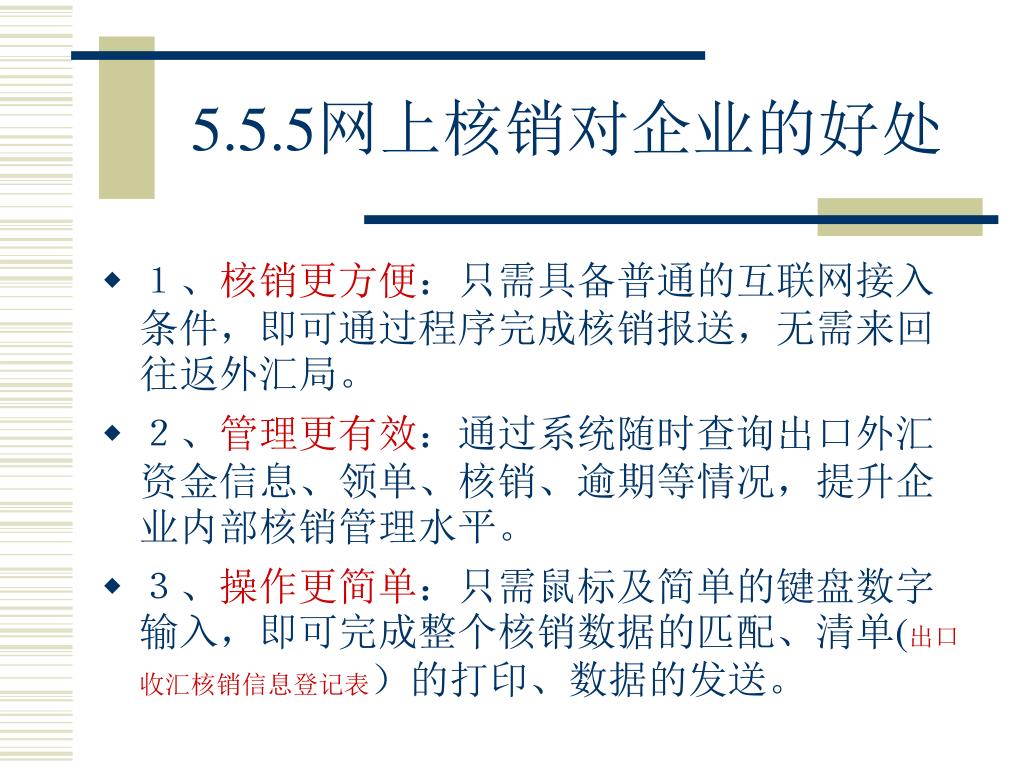 5.5.5网上核销对企业的好处 • 1、核销更方便:只需具备普通的互联网接入条件,即可通过程序完成核销报送,无需来回往返外汇局。 • 2、管理更有效:通过系统随时查询出口外汇资金信息、领单、核销、逾期等情况,提升企业内部核销管理水平。 • 3、操作更简单:只需鼠标及简单的键盘数字输入,即可完成整个核销数据的匹配、清单(出口收汇核销信息登记表)的打印、数据的发送。
