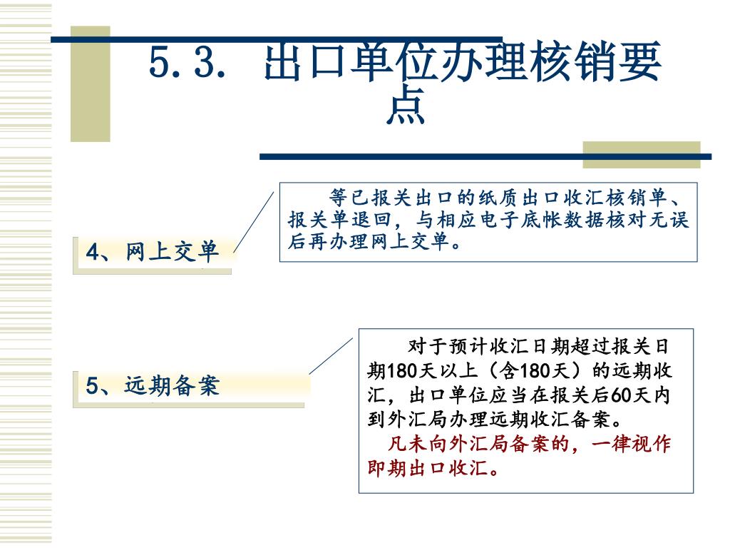 5.3. 出口单位办理核销要点 等已报关出口的纸质出口收汇核销单、报关单退回,与相应电子底帐数据核对无误后再办理网上交单。 4、网上交单 对于预计收汇日期超过报关日期180天以上(含180天)的远期收汇,出口单位应当在报关后60天内到外汇局办理远期收汇备案。 凡未向外汇局备案的,一律视作即期出口收汇。 5、远期备案