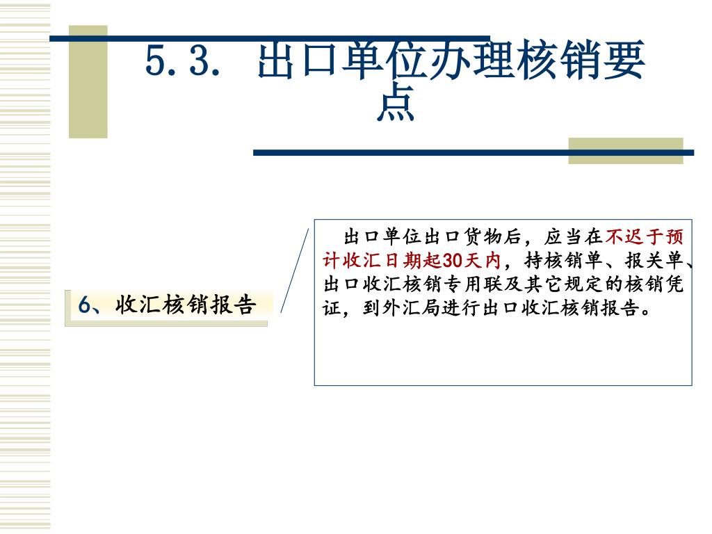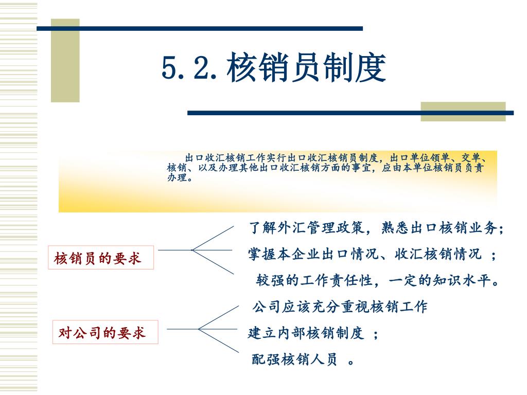 了解外汇管理政策,熟悉出口核销业务; 公司应该充分重视核销工作 5.2.核销员制度 出口收汇核销工作实行出口收汇核销员制度,出口单位领单、交单、核销、以及办理其他出口收汇核销方面的事宜,应由本单位核销员负责办理。 掌握本企业出口情况、收汇核销情况 ; 核销员的要求 较强的工作责任性,一定的知识水平。 对公司的要求 建立内部核销制度 ; 配强核销人员 。