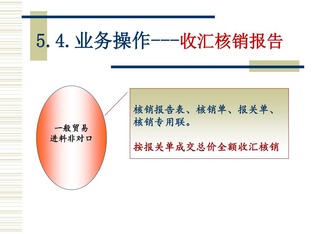 5.4.业务操作---收汇核销报告 一般贸易 进料非对口 核销报告表、核销单、报关单、核销专用联。 按报关单成交总价全额收汇核销