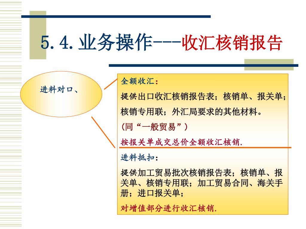 5.4.业务操作---收汇核销报告 进料对口、 全额收汇: 提供出口收汇核销报告表;核销单、报关单; 核销专用联;外汇局要求的其他材料。 (同“一般贸易”) 按报关单成交总价全额收汇核销. 进料抵扣: 提供加工贸易批次核销报告表;核销单、报关单、核销专用联;加工贸易合同、海关手册;进口报关单; 对增值部分进行收汇核销.