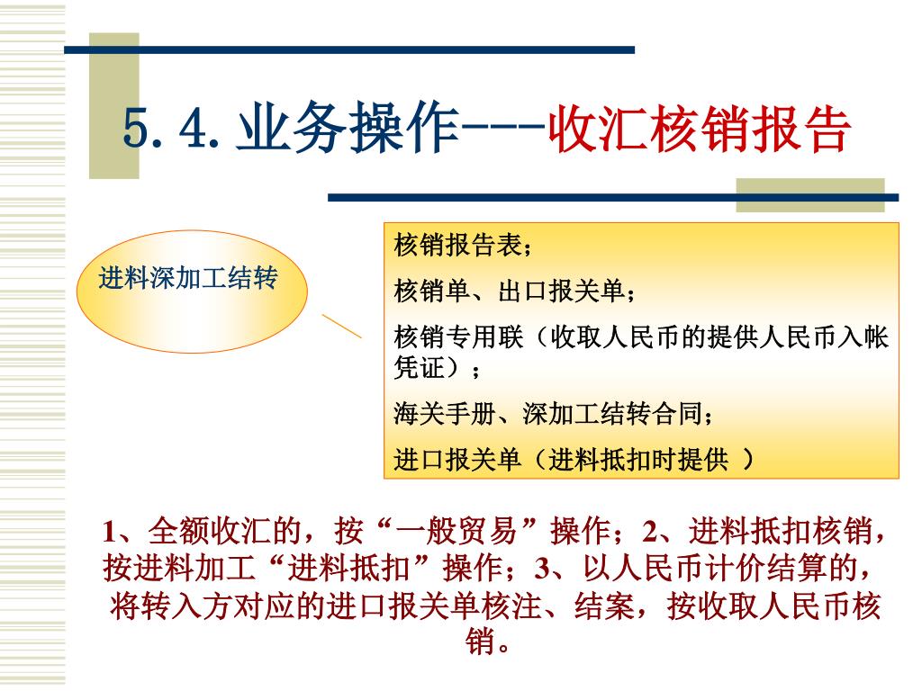 5.4.业务操作---收汇核销报告 核销报告表; 核销单、出口报关单; 核销专用联(收取人民币的提供人民币入帐凭证); 海关手册、深加工结转合同; 进口报关单(进料抵扣时提供 ) 进料深加工结转 1、全额收汇的,按“一般贸易”操作;2、进料抵扣核销,按进料加工“进料抵扣”操作;3、以人民币计价结算的,将转入方对应的进口报关单核注、结案,按收取人民币核销。