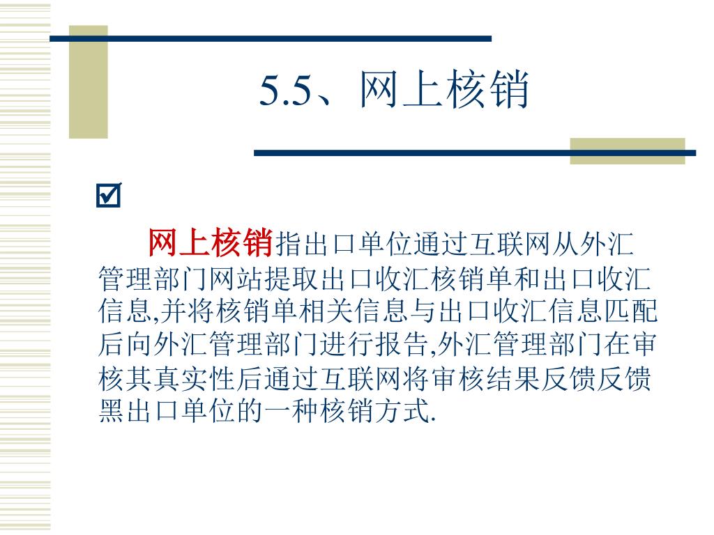 5.5、网上核销 网上核销指出口单位通过互联网从外汇 管理部门网站提取出口收汇核销单和出口收汇信息,并将核销单相关信息与出口收汇信息匹配后向外汇管理部门进行报告,外汇管理部门在审核其真实性后通过互联网将审核结果反馈反馈黑出口单位的一种核销方式.