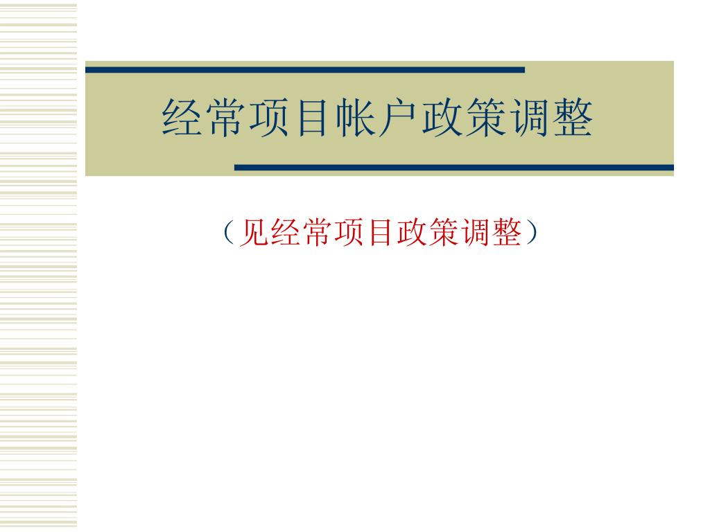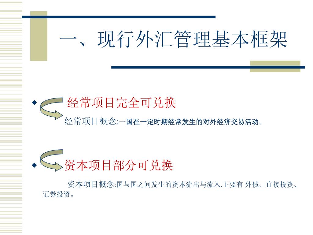 一、现行外汇管理基本框架 • 经常项目完全可兑换 经常项目概念:一国在一定时期经常发生的对外经济交易活动。 • 资本项目部分可兑换 资本项目概念:国与国之间发生的资本流出与流入.主要有 外债、直接投资、证券投资。