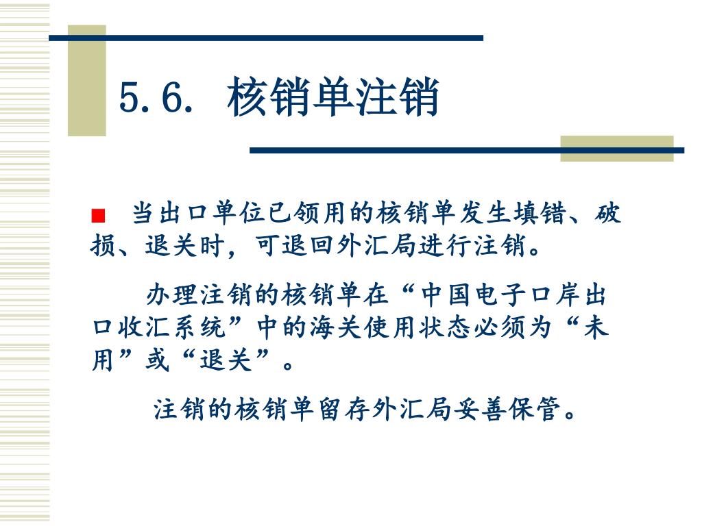 5.6. 核销单注销 • 当出口单位已领用的核销单发生填错、破损、退关时,可退回外汇局进行注销。 • 办理注销的核销单在“中国电子口岸出口收汇系统”中的海关使用状态必须为“未用”或“退关”。 • 注销的核销单留存外汇局妥善保管。