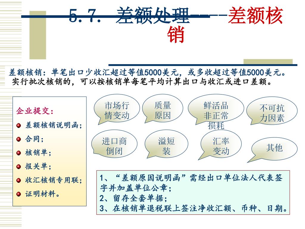 5.7. 差额处理----差额核销 差额核销:单笔出口少收汇超过等值5000美元,或多收超过等值5000美元。实行批次核销的,可以按核销单每笔平均计算出口与收汇或进口差额。 市场行情变动 质量 原因 鲜活品非正常损耗 • 企业提交: • 差额核销说明函; • 合同; • 核销单; • 报关单; • 收汇核销专用联; • 证明材料。 不可抗力因素 进口商倒闭 溢短装 汇率变动 其他 1、“差额原因说明函”需经出口单位法人代表签字并加盖单位公章; 2、留存全套单据; 3、在核销单退税联上签注净收汇额、币种、日期。