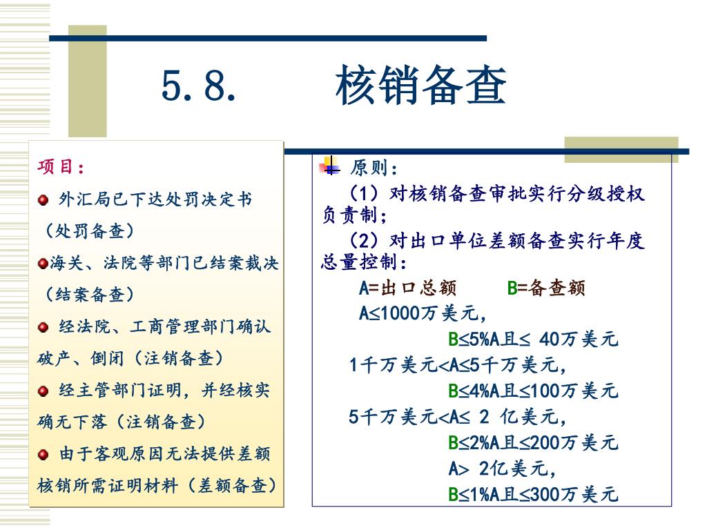 5.8. 核销备查 • 项目: • 外汇局已下达处罚决定书 • (处罚备查) • 海关、法院等部门已结案裁决 • (结案备查) • 经法院、工商管理部门确认 • 破产、倒闭(注销备查) • 经主管部门证明,并经核实 • 确无下落(注销备查) • 由于客观原因无法提供差额 • 核销所需证明材料(差额备查) 原则: (1)对核销备查审批实行分级授权负责制; (2)对出口单位差额备查实行年度总量控制: A=出口总额 B=备查额 A1000万美元, B5%A且 40万美元 1千万美元A5千万美元, B4%A且100万美元 5千万美元A 2 亿美元, B2%A且200万美元 A 2亿美元, B1%A且300万美元