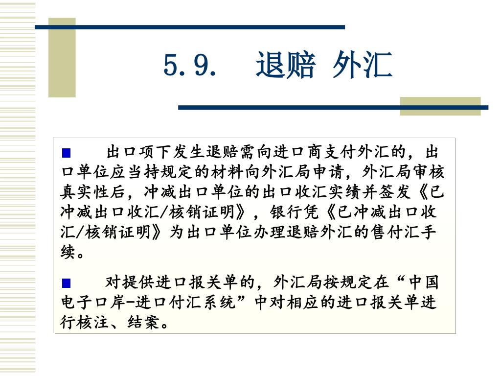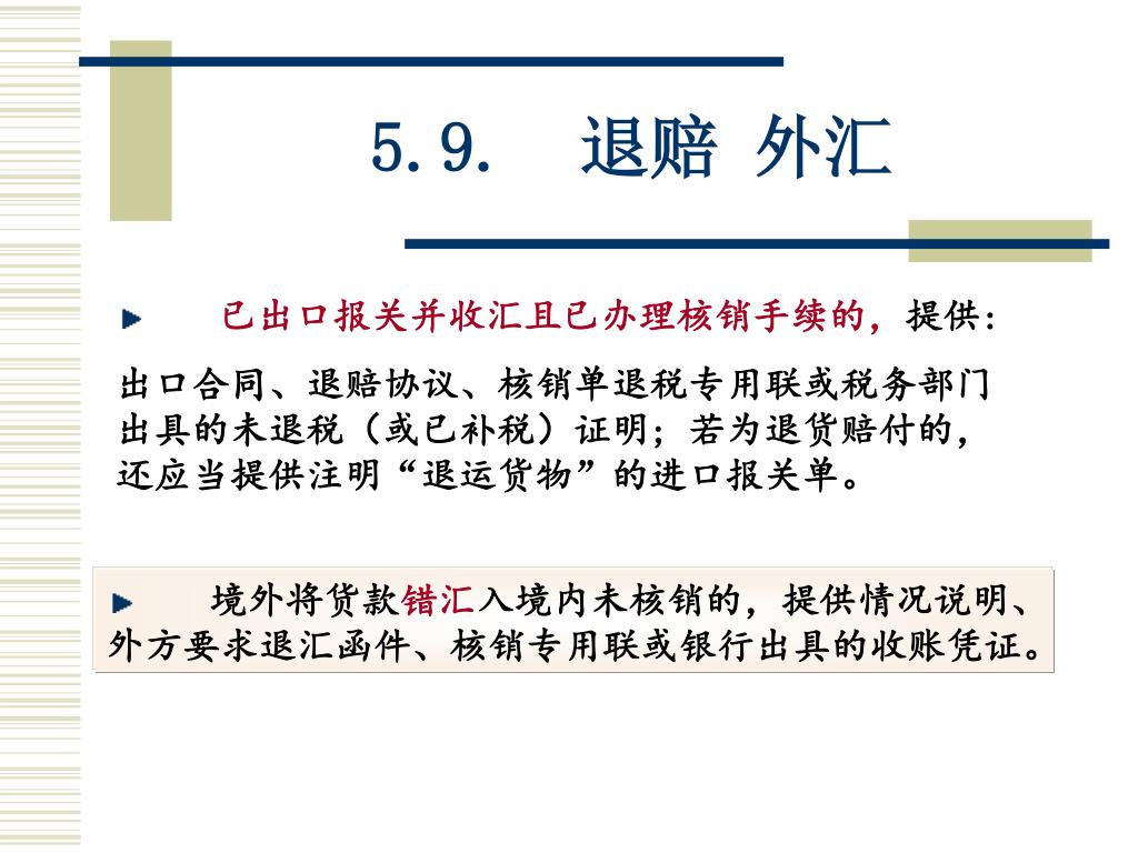 5.9. 退赔 外汇 • 出口项下发生退赔需向进口商支付外汇的,出口单位应当持规定的材料向外汇局申请,外汇局审核真实性后,冲减出口单位的出口收汇实绩并签发《已冲减出口收汇/核销证明》,银行凭《已冲减出口收汇/核销证明》为出口单位办理退赔外汇的售付汇手续。 • 对提供进口报关单的,外汇局按规定在“中国电子口岸-进口付汇系统”中对相应的进口报关单进行核注、结案。
