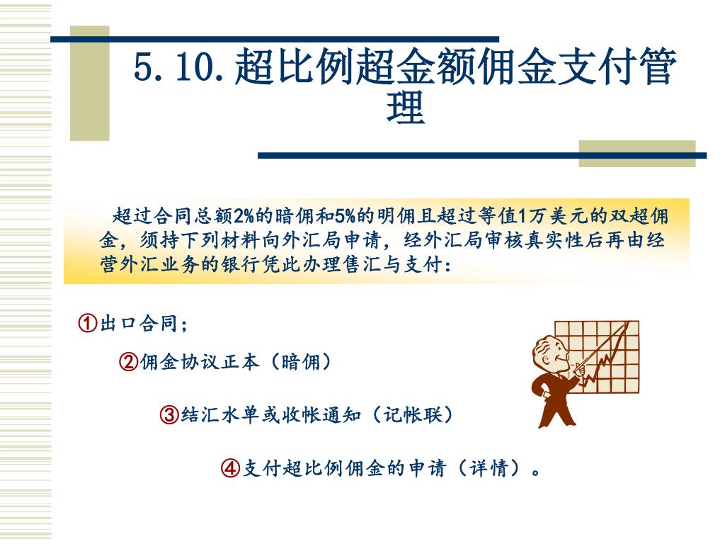 5.10.超比例超金额佣金支付管理 超过合同总额2%的暗佣和5%的明佣且超过等值1万美元的双超佣金,须持下列材料向外汇局申请,经外汇局审核真实性后再由经营外汇业务的银行凭此办理售汇与支付: ①出口合同; ②佣金协议正本(暗佣) ③结汇水单或收帐通知(记帐联) ④支付超比例佣金的申请(详情)。