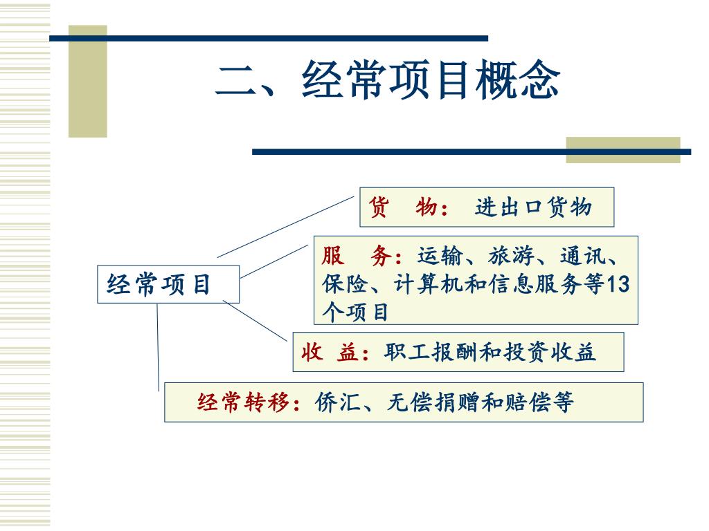 二、经常项目概念 货 物: 进出口货物 服 务:运输、旅游、通讯、保险、计算机和信息服务等13个项目 经常项目 收 益:职工报酬和投资收益 经常转移:侨汇、无偿捐赠和赔偿等
