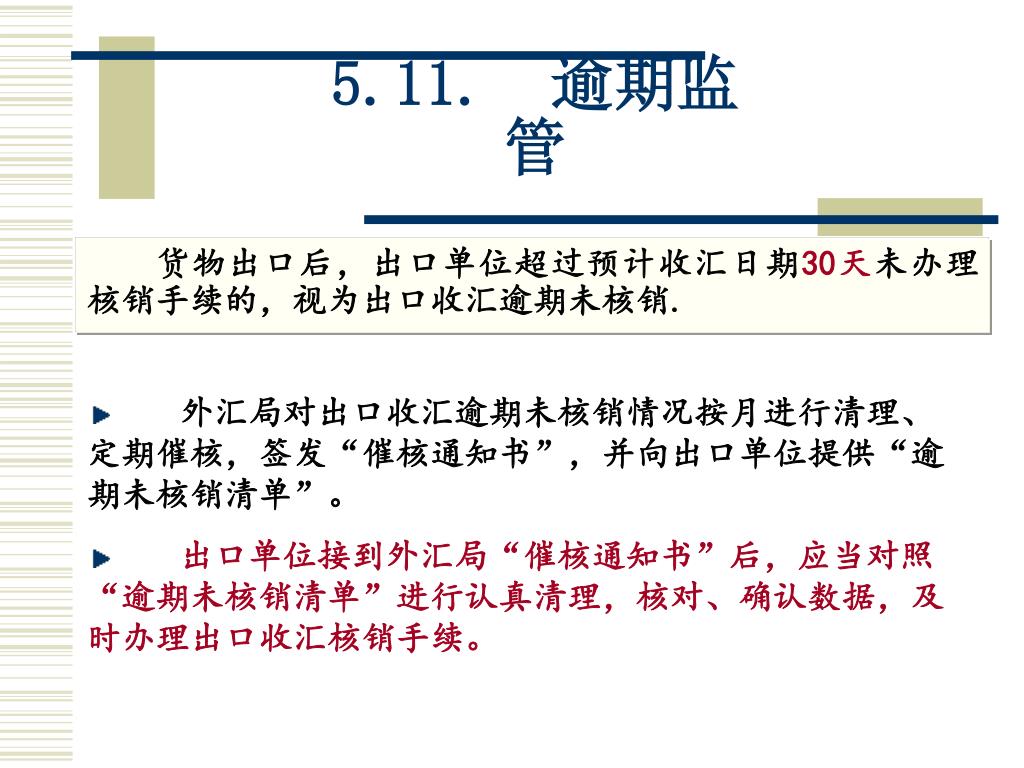 5.11. 逾期监管 货物出口后,出口单位超过预计收汇日期30天未办理核销手续的,视为出口收汇逾期未核销. • 外汇局对出口收汇逾期未核销情况按月进行清理、定期催核,签发“催核通知书”,并向出口单位提供“逾期未核销清单”。 • 出口单位接到外汇局“催核通知书”后,应当对照“逾期未核销清单”进行认真清理,核对、确认数据,及时办理出口收汇核销手续。