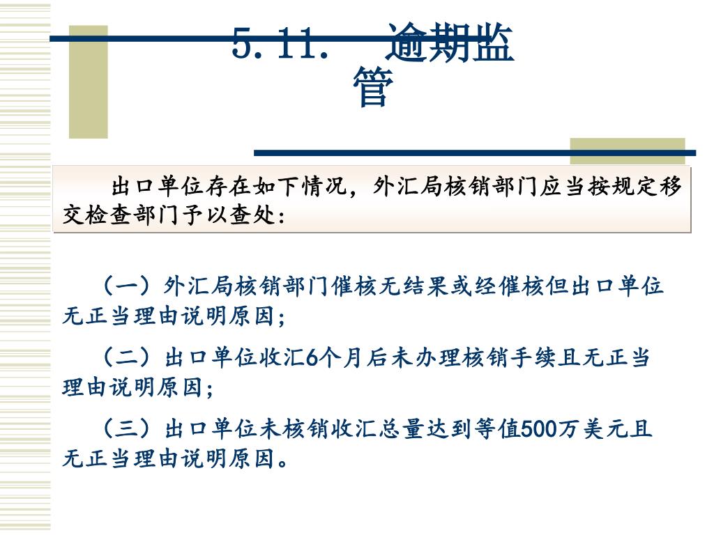 5.11. 逾期监管 出口单位存在如下情况,外汇局核销部门应当按规定移交检查部门予以查处: (一)外汇局核销部门催核无结果或经催核但出口单位无正当理由说明原因; (二)出口单位收汇6个月后未办理核销手续且无正当理由说明原因; (三)出口单位未核销收汇总量达到等值500万美元且无正当理由说明原因。