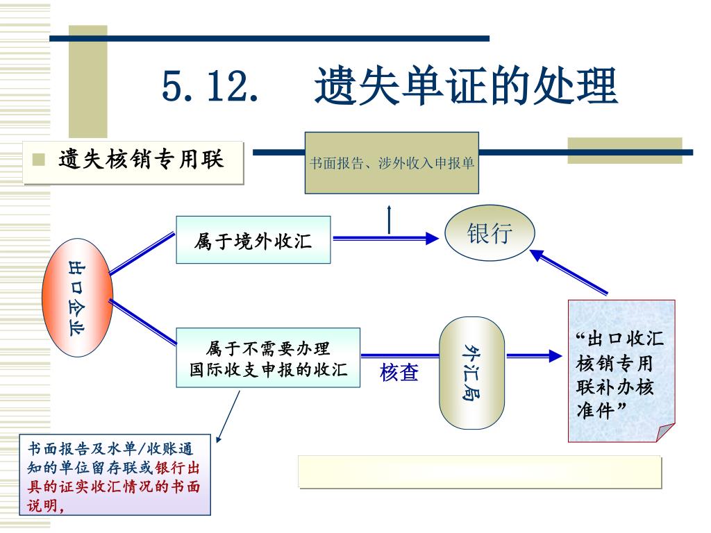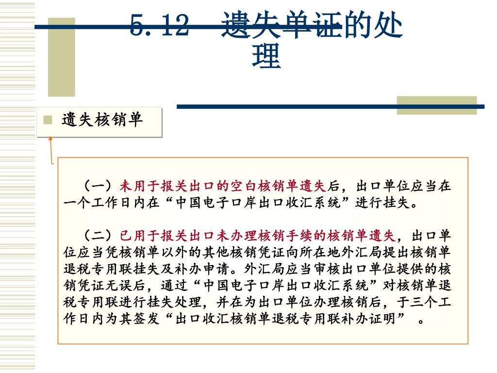 5.12 遗失单证的处理 • 遗失核销单 (一)未用于报关出口的空白核销单遗失后,出口单位应当在一个工作日内在“中国电子口岸出口收汇系统”进行挂失。 (二)已用于报关出口未办理核销手续的核销单遗失,出口单位应当凭核销单以外的其他核销凭证向所在地外汇局提出核销单退税专用联挂失及补办申请。外汇局应当审核出口单位提供的核销凭证无误后,通过“中国电子口岸出口收汇系统”对核销单退税专用联进行挂失处理,并在为出口单位办理核销后,于三个工作日内为其签发“出口收汇核销单退税专用联补办证明” 。
