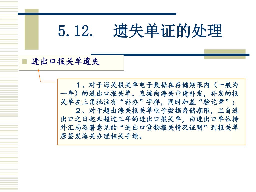5.12. 遗失单证的处理 • 进出口报关单遗失 1、对于海关报关单电子数据在存储期限内(一般为一年)的进出口报关单,直接向海关申请补发,补发的报关单左上角批注有“补办”字样,同时加盖“验讫章”; 2、对于超出海关报关单电子数据存储期限,且自进出口之日起未超过三年的进出口报关单,由进出口单位持外汇局签署意见的“进出口货物报关情况证明”到报关单原签发海关办理相关手续。