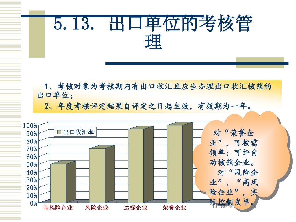 5.13. 出口单位的考核管理 1、考核对象为考核期内有出口收汇且应当办理出口收汇核销的出口单位; 2、年度考核评定结果自评定之日起生效,有效期为一年。 对“荣誉企业”,可按需领单;可评自动核销企业。 对“风险企业”、“高风险企业”,实行控制发单。