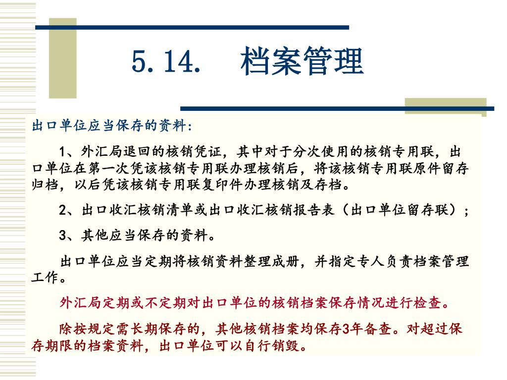5.14. 档案管理 出口单位应当保存的资料: 1、外汇局退回的核销凭证,其中对于分次使用的核销专用联,出口单位在第一次凭该核销专用联办理核销后,将该核销专用联原件留存归档,以后凭该核销专用联复印件办理核销及存档。 2、出口收汇核销清单或出口收汇核销报告表(出口单位留存联); 3、其他应当保存的资料。 出口单位应当定期将核销资料整理成册,并指定专人负责档案管理工作。 外汇局定期或不定期对出口单位的核销档案保存情况进行检查。 除按规定需长期保存的,其他核销档案均保存3年备查。对超过保存期限的档案资料,出口单位可以自行销毁。