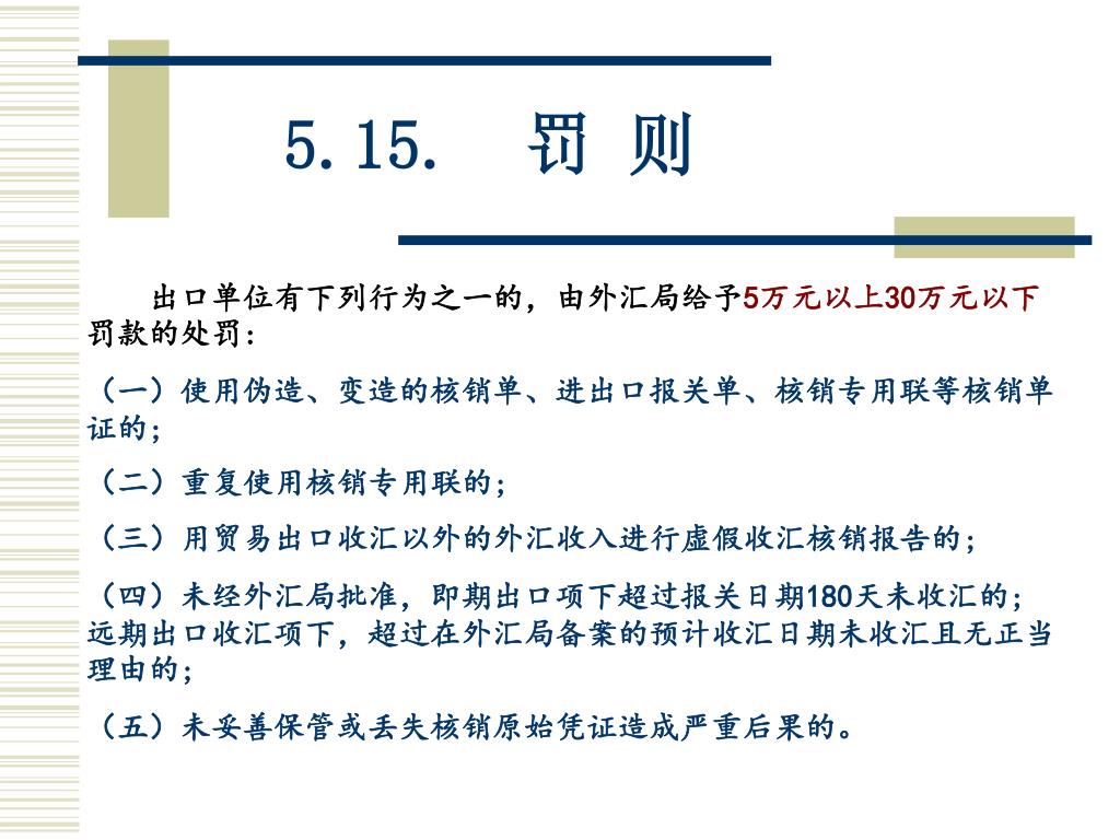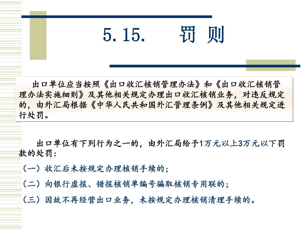 5.15. 罚 则 出口单位有下列行为之一的,由外汇局给予5万元以上30万元以下罚款的处罚: (一)使用伪造、变造的核销单、进出口报关单、核销专用联等核销单证的; (二)重复使用核销专用联的; (三)用贸易出口收汇以外的外汇收入进行虚假收汇核销报告的; (四)未经外汇局批准,即期出口项下超过报关日期180天未收汇的; 远期出口收汇项下,超过在外汇局备案的预计收汇日期未收汇且无正当理由的; (五)未妥善保管或丢失核销原始凭证造成严重后果的。