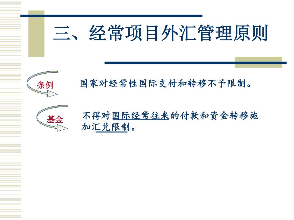 条例 基金 三、经常项目外汇管理原则 国家对经常性国际支付和转移不予限制。 不得对国际经常往来的付款和资金转移施加汇兑限制。