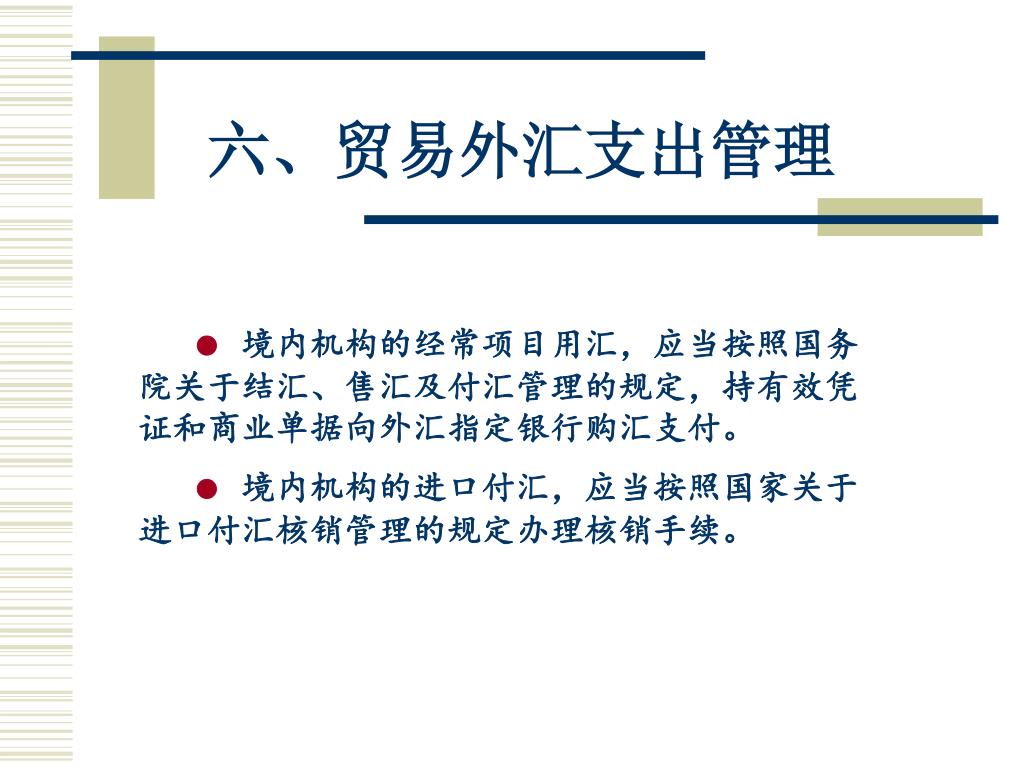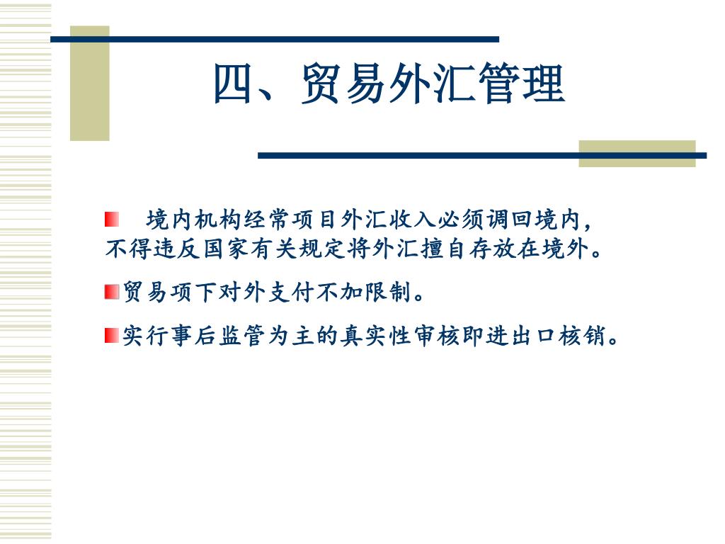 四、贸易外汇管理 • 境内机构经常项目外汇收入必须调回境内,不得违反国家有关规定将外汇擅自存放在境外。 • 贸易项下对外支付不加限制。 • 实行事后监管为主的真实性审核即进出口核销。