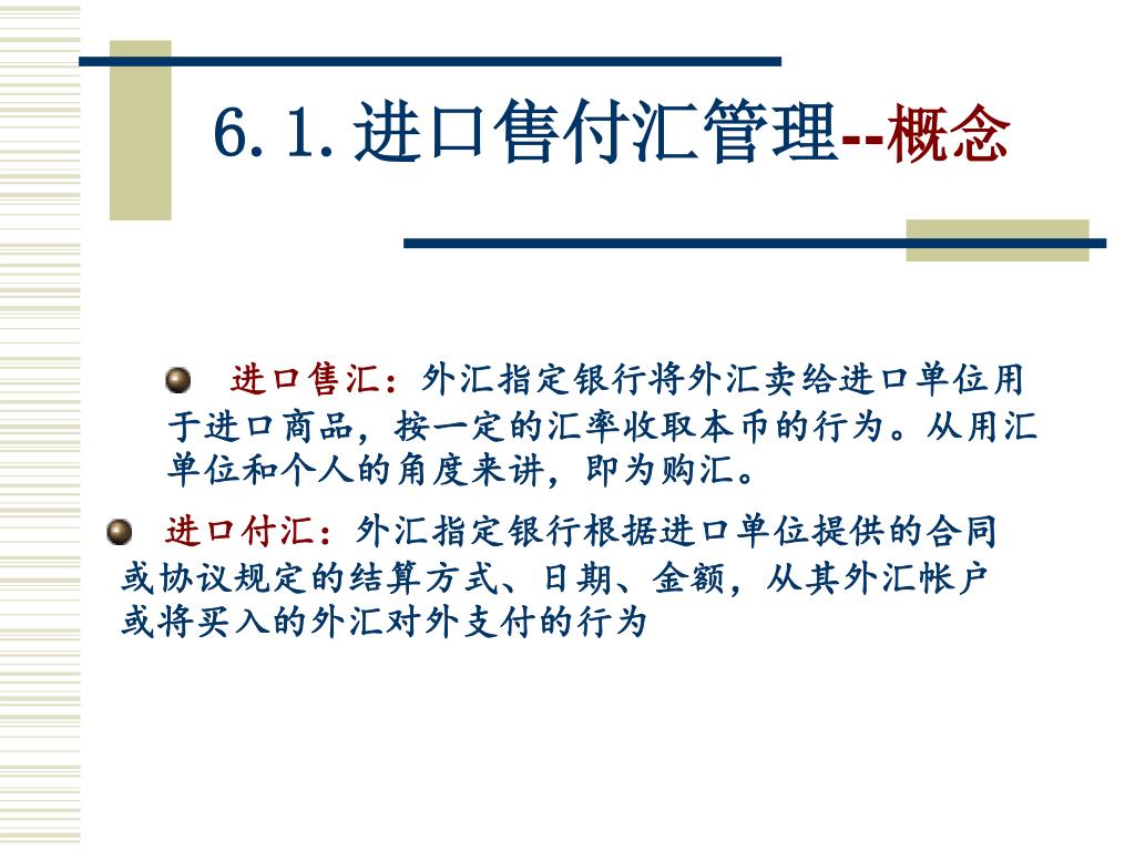 6.1.进口售付汇管理--概念 • 进口售汇:外汇指定银行将外汇卖给进口单位用于进口商品,按一定的汇率收取本币的行为。从用汇单位和个人的角度来讲,即为购汇。 进口付汇:外汇指定银行根据进口单位提供的合同或协议规定的结算方式、日期、金额,从其外汇帐户或将买入的外汇对外支付的行为