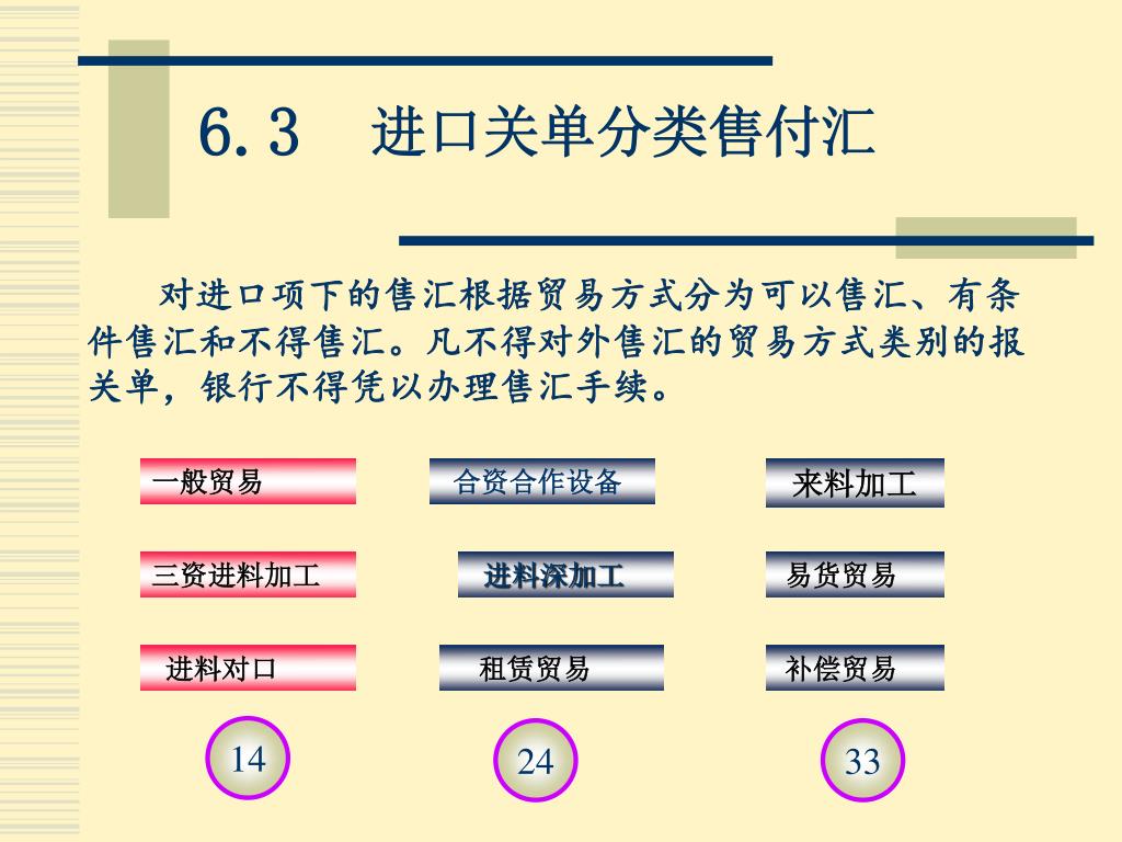 6.3 进口关单分类售付汇 对进口项下的售汇根据贸易方式分为可以售汇、有条件售汇和不得售汇。凡不得对外售汇的贸易方式类别的报关单,银行不得凭以办理售汇手续。 一般贸易 合资合作设备 来料加工 三资进料加工 进料深加工 易货贸易 进料对口 租赁贸易 补偿贸易 14 24 33