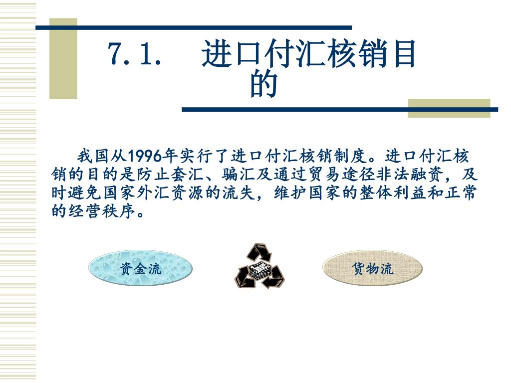 7.1. 进口付汇核销目的 我国从1996年实行了进口付汇核销制度。进口付汇核销的目的是防止套汇、骗汇及通过贸易途径非法融资,及时避免国家外汇资源的流失,维护国家的整体利益和正常的经营秩序。 资金流 货物流