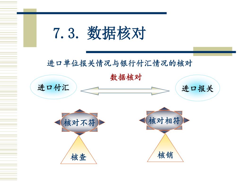 7.3.数据核对 进口单位报关情况与银行付汇情况的核对 数据核对 进口付汇 进口报关 核对相符 核对不符 核销 核查