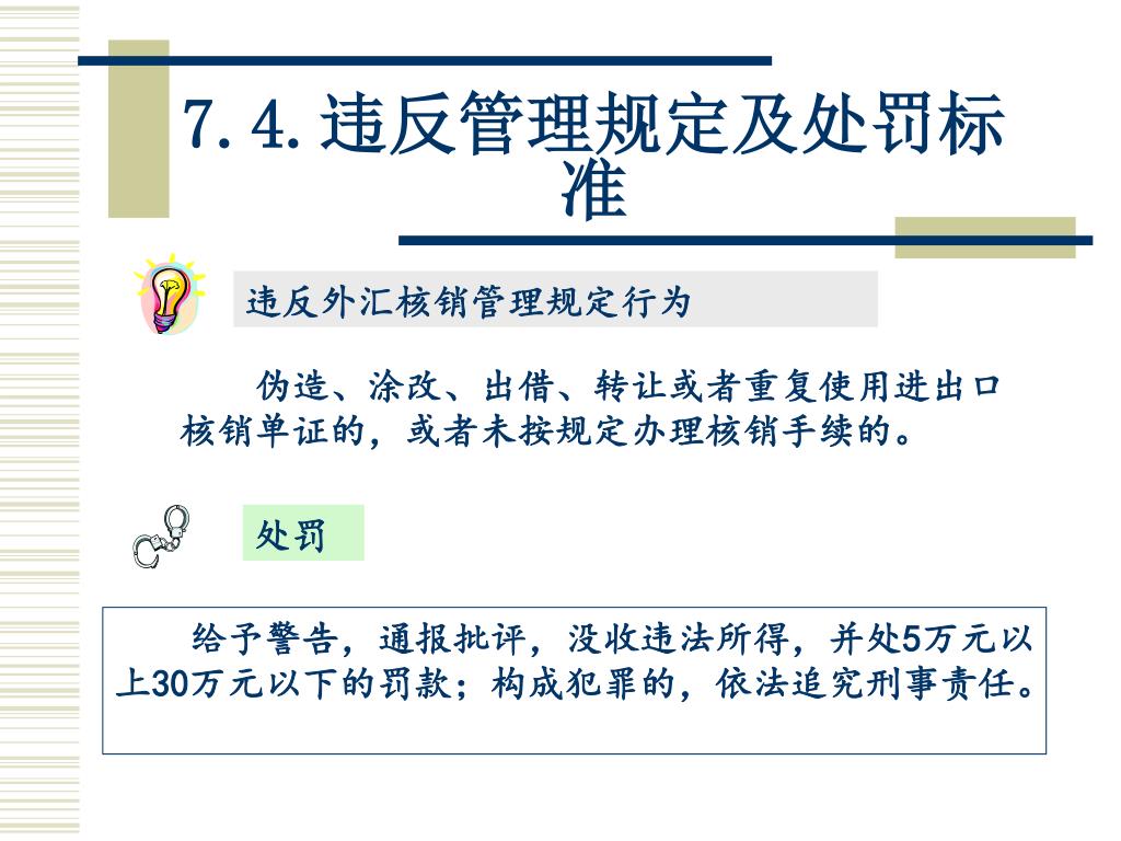 7.4.违反管理规定及处罚标准 违反外汇核销管理规定行为 伪造、涂改、出借、转让或者重复使用进出口核销单证的,或者未按规定办理核销手续的。 处罚 给予警告,通报批评,没收违法所得,并处5万元以上30万元以下的罚款;构成犯罪的,依法追究刑事责任。