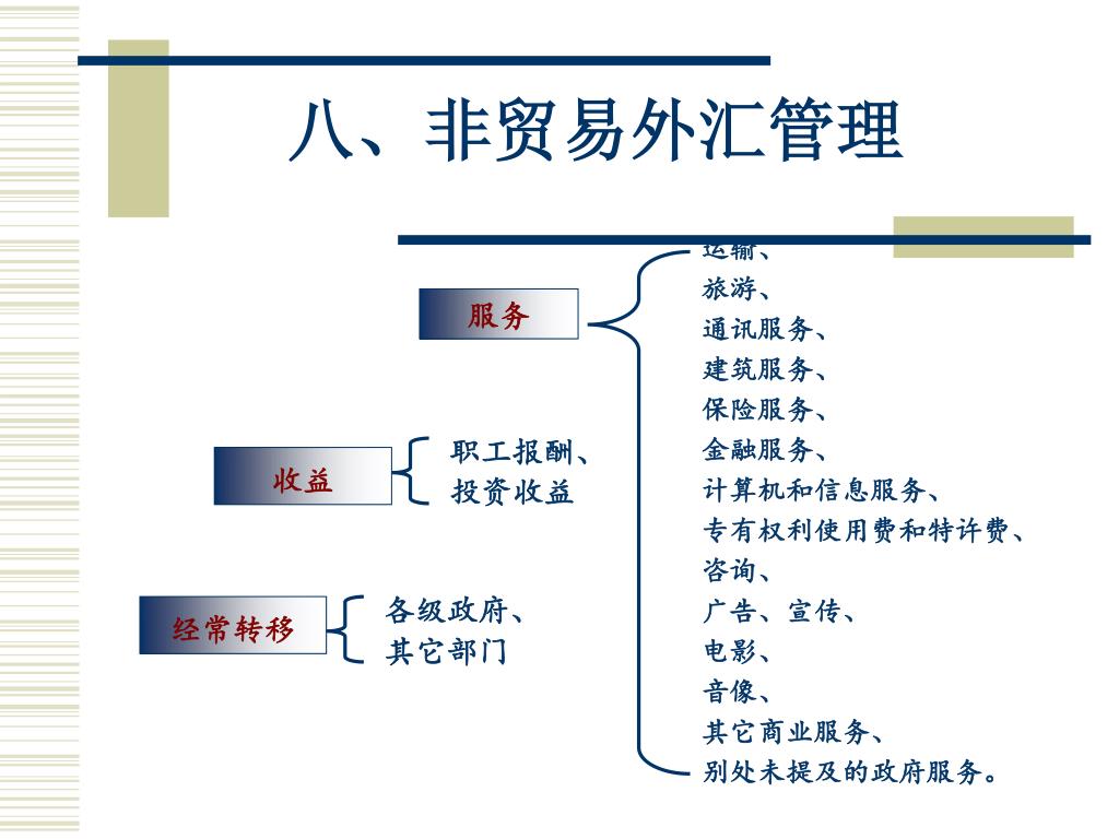 八、非贸易外汇管理 运输、 旅游、 通讯服务、 建筑服务、 保险服务、 金融服务、 计算机和信息服务、 专有权利使用费和特许费、 咨询、 广告、宣传、 电影、 音像、 其它商业服务、 别处未提及的政府服务。 服务 职工报酬、 投资收益 收益 各级政府、 其它部门 经常转移