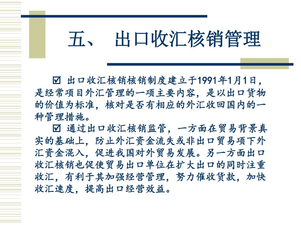五、 出口收汇核销管理 出口收汇核销核销制度建立于1991年1月1日,是经常项目外汇管理的一项主要内容,是以出口货物的价值为标准,核对是否有相应的外汇收回国内的一种管理措施。 通过出口收汇核销监管,一方面在贸易背景真实的基础上,防止外汇资金流失或非出口贸易项下外汇资金混入,促进我国对外贸易发展。另一方面出口收汇核销也促使贸易出口单位在扩大出口的同时注重收汇,有利于其加强经营管理,努力催收货款,加快收汇速度,提高出口经营效益。