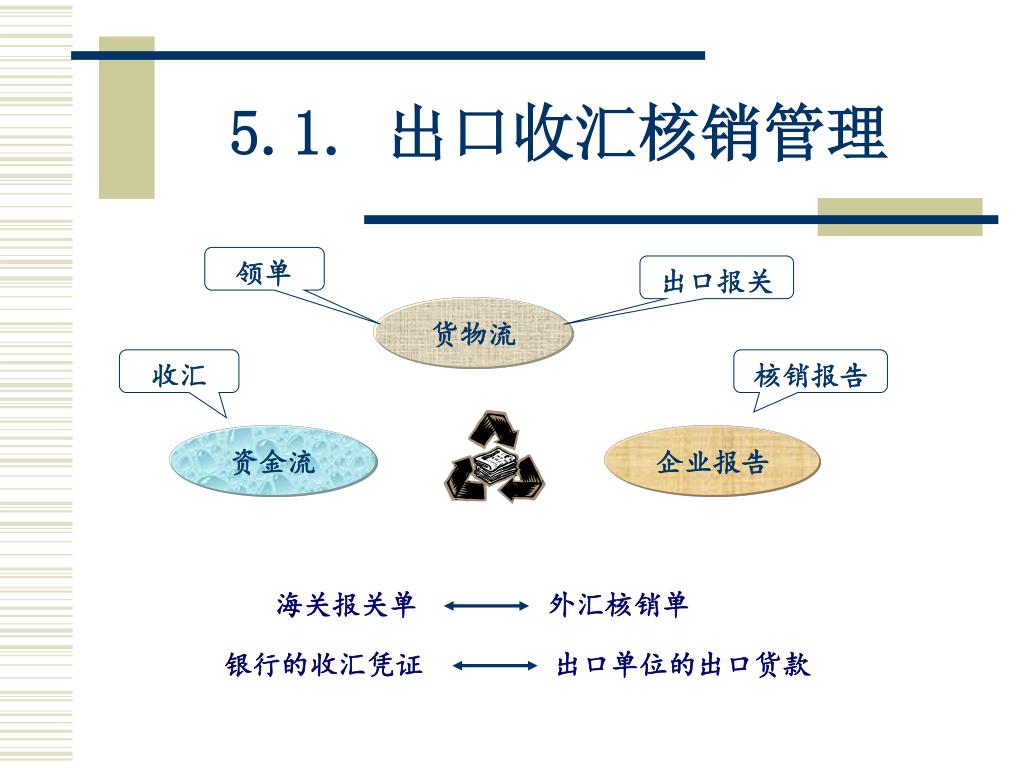 5.1. 出口收汇核销管理 领单 出口报关 货物流 收汇 核销报告 资金流 企业报告 海关报关单 外汇核销单 银行的收汇凭证 出口单位的出口货款