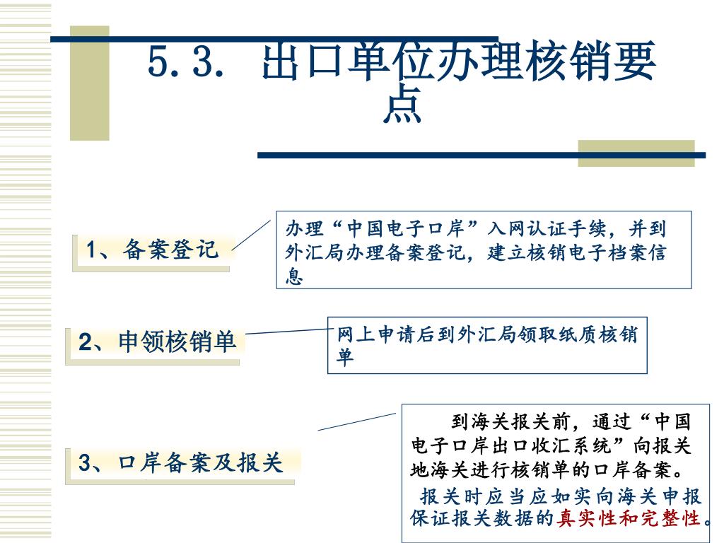5.3. 出口单位办理核销要点 办理“中国电子口岸”入网认证手续,并到外汇局办理备案登记,建立核销电子档案信息 1、备案登记 网上申请后到外汇局领取纸质核销单 2、申领核销单 到海关报关前,通过“中国电子口岸出口收汇系统”向报关地海关进行核销单的口岸备案。 报关时应当应如实向海关申报保证报关数据的真实性和完整性。 3、口岸备案及报关