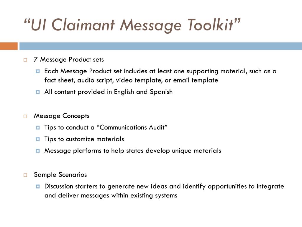“UI Claimant Message Toolkit” • 7 Message Product sets • Each Message Product set includes at least one supporting material, such as a fact sheet, audio script, video template, or email template • All content provided in English and Spanish • Message Concepts • Tips to conduct a “Communications Audit” • Tips to customize materials • Message platforms to help states develop unique materials • Sample Scenarios • Discussion starters to generate new ideas and identify opportunities to integrate and deliver messages within existing systems