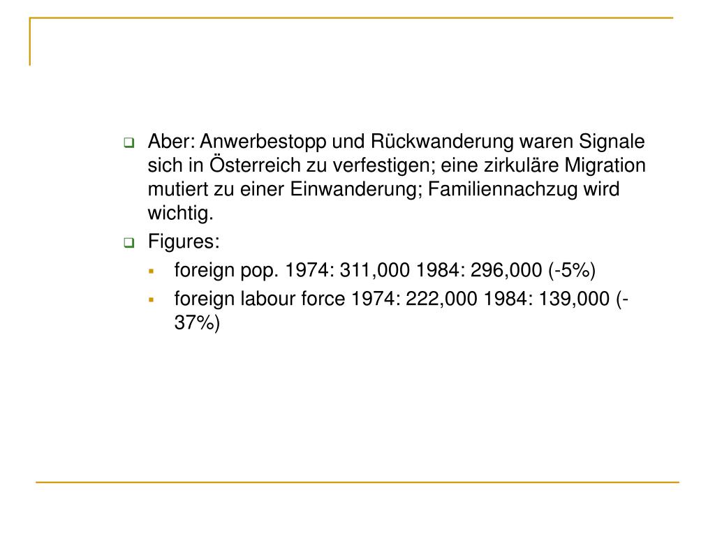 Aber: Anwerbestopp und Rückwanderung waren Signale sich in Österreich zu verfestigen; eine zirkuläre Migration mutiert zu einer Einwanderung; Familiennachzug wird wichtig. • Figures: • foreign pop. 1974: 311,000 1984: 296,000 (-5%) • foreign labour force 1974: 222,000 1984: 139,000 (-37%)