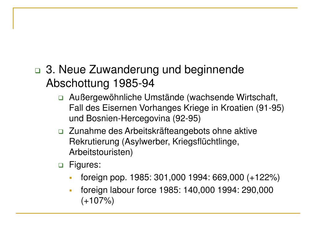 3. Neue Zuwanderung und beginnende Abschottung 1985-94 • Außergewöhnliche Umstände (wachsende Wirtschaft, Fall des Eisernen Vorhanges Kriege in Kroatien (91-95) und Bosnien-Hercegovina (92-95) • Zunahme des Arbeitskräfteangebots ohne aktive Rekrutierung (Asylwerber, Kriegsflüchtlinge, Arbeitstouristen) • Figures: • foreign pop. 1985: 301,000 1994: 669,000 (+122%) • foreign labour force 1985: 140,000 1994: 290,000 (+107%)