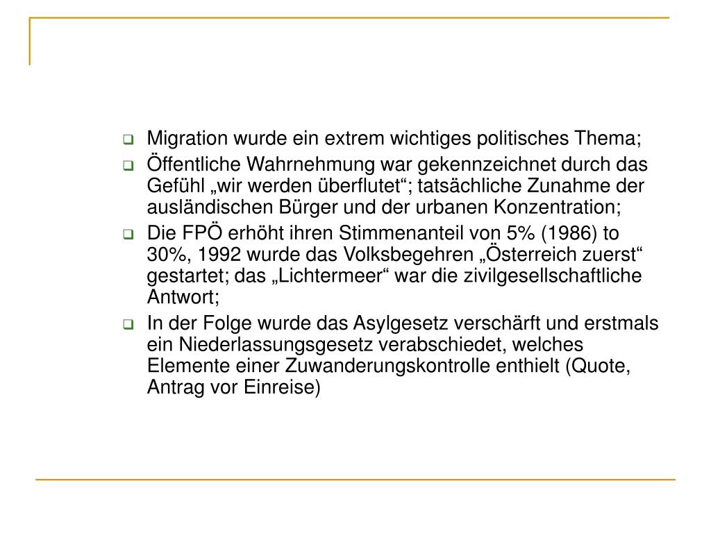 Migration wurde ein extrem wichtiges politisches Thema; • Öffentliche Wahrnehmung war gekennzeichnet durch das Gefühl „wir werden überflutet“; tatsächliche Zunahme der ausländischen Bürger und der urbanen Konzentration; • Die FPÖ erhöht ihren Stimmenanteil von 5% (1986) to 30%, 1992 wurde das Volksbegehren „Österreich zuerst“ gestartet; das „Lichtermeer“ war die zivilgesellschaftliche Antwort; • In der Folge wurde das Asylgesetz verschärft und erstmals ein Niederlassungsgesetz verabschiedet, welches Elemente einer Zuwanderungskontrolle enthielt (Quote, Antrag vor Einreise)