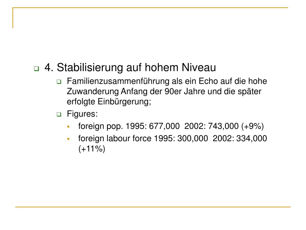 4. Stabilisierung auf hohem Niveau • Familienzusammenführung als ein Echo auf die hohe Zuwanderung Anfang der 90er Jahre und die später erfolgte Einbürgerung; • Figures: • foreign pop. 1995: 677,000 2002: 743,000 (+9%) • foreign labour force 1995: 300,000 2002: 334,000 (+11%)