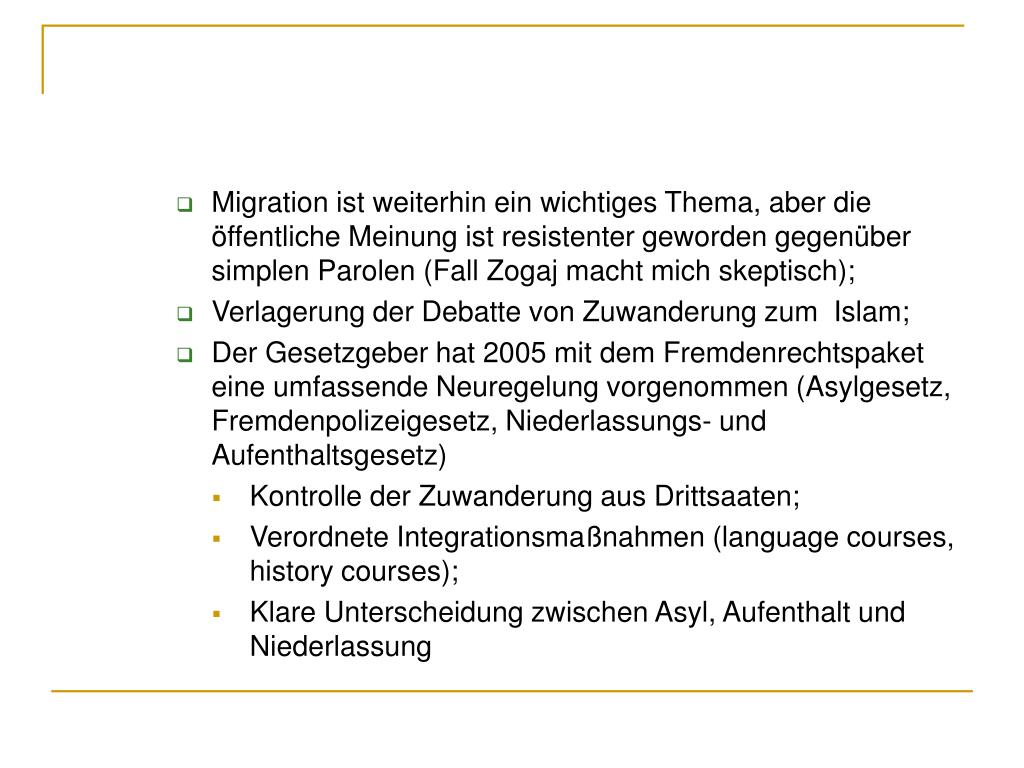 Migration ist weiterhin ein wichtiges Thema, aber die öffentliche Meinung ist resistenter geworden gegenüber simplen Parolen (Fall Zogaj macht mich skeptisch); • Verlagerung der Debatte von Zuwanderung zum Islam; • Der Gesetzgeber hat 2005 mit dem Fremdenrechtspaket eine umfassende Neuregelung vorgenommen (Asylgesetz, Fremdenpolizeigesetz, Niederlassungs- und Aufenthaltsgesetz) • Kontrolle der Zuwanderung aus Drittsaaten; • Verordnete Integrationsmaßnahmen (language courses, history courses); • Klare Unterscheidung zwischen Asyl, Aufenthalt und Niederlassung