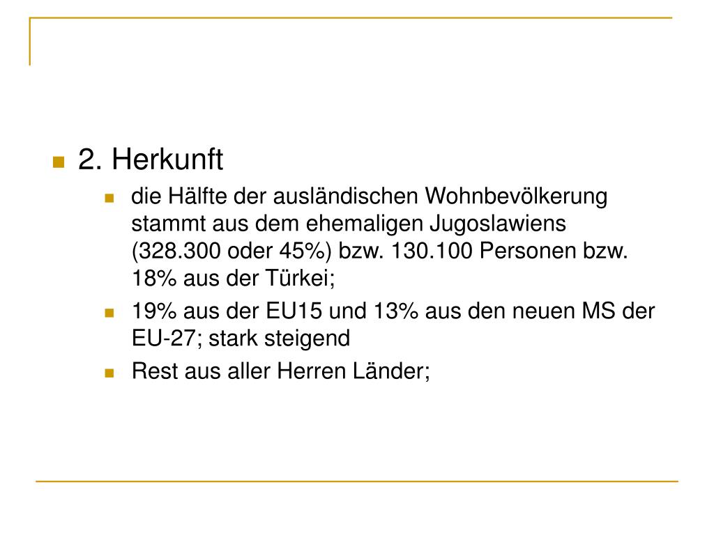 2. Herkunft • die Hälfte der ausländischen Wohnbevölkerung stammt aus dem ehemaligen Jugoslawiens (328.300 oder 45%) bzw. 130.100 Personen bzw. 18% aus der Türkei; • 19% aus der EU15 und 13% aus den neuen MS der EU-27; stark steigend • Rest aus aller Herren Länder;