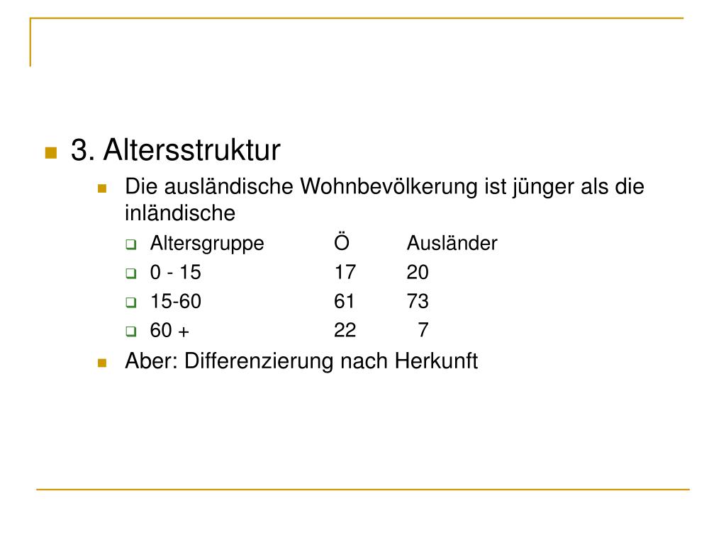 3. Altersstruktur • Die ausländische Wohnbevölkerung ist jünger als die inländische • Altersgruppe Ö Ausländer • 0 - 15 17 20 • 15-60 61 73 • 60 + 22 7 • Aber: Differenzierung nach Herkunft