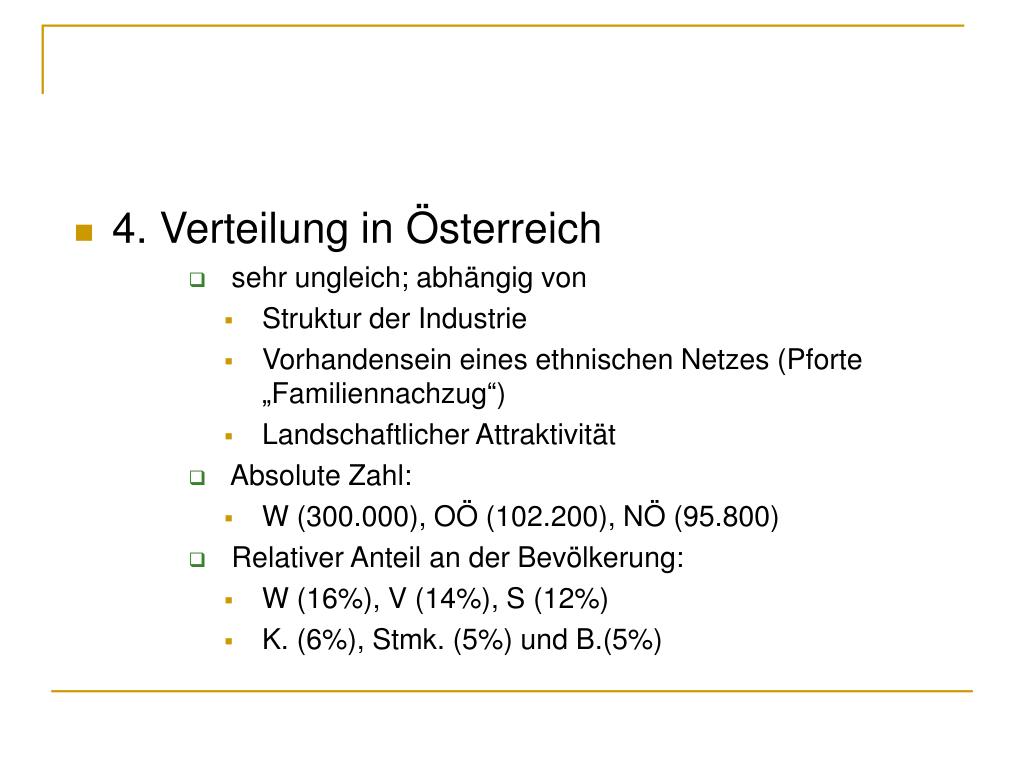 4. Verteilung in Österreich • sehr ungleich; abhängig von • Struktur der Industrie • Vorhandensein eines ethnischen Netzes (Pforte „Familiennachzug“) • Landschaftlicher Attraktivität • Absolute Zahl: • W (300.000), OÖ (102.200), NÖ (95.800) • Relativer Anteil an der Bevölkerung: • W (16%), V (14%), S (12%) • K. (6%), Stmk. (5%) und B.(5%)