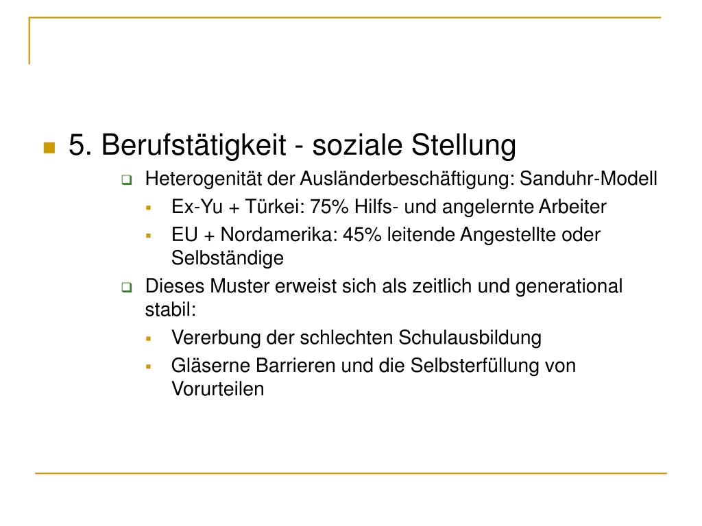 5. Berufstätigkeit - soziale Stellung • Heterogenität der Ausländerbeschäftigung: Sanduhr-Modell • Ex-Yu + Türkei: 75% Hilfs- und angelernte Arbeiter • EU + Nordamerika: 45% leitende Angestellte oder Selbständige • Dieses Muster erweist sich als zeitlich und generational stabil: • Vererbung der schlechten Schulausbildung • Gläserne Barrieren und die Selbsterfüllung von Vorurteilen